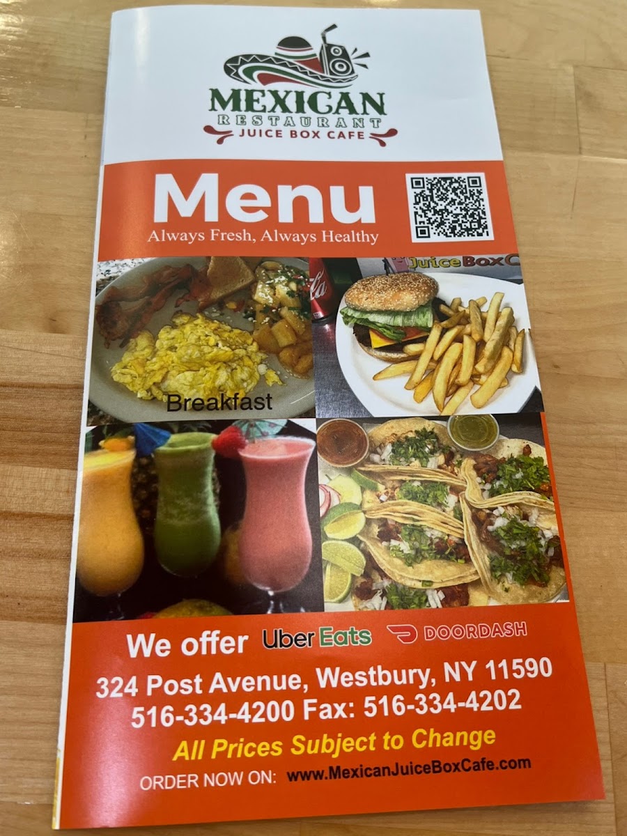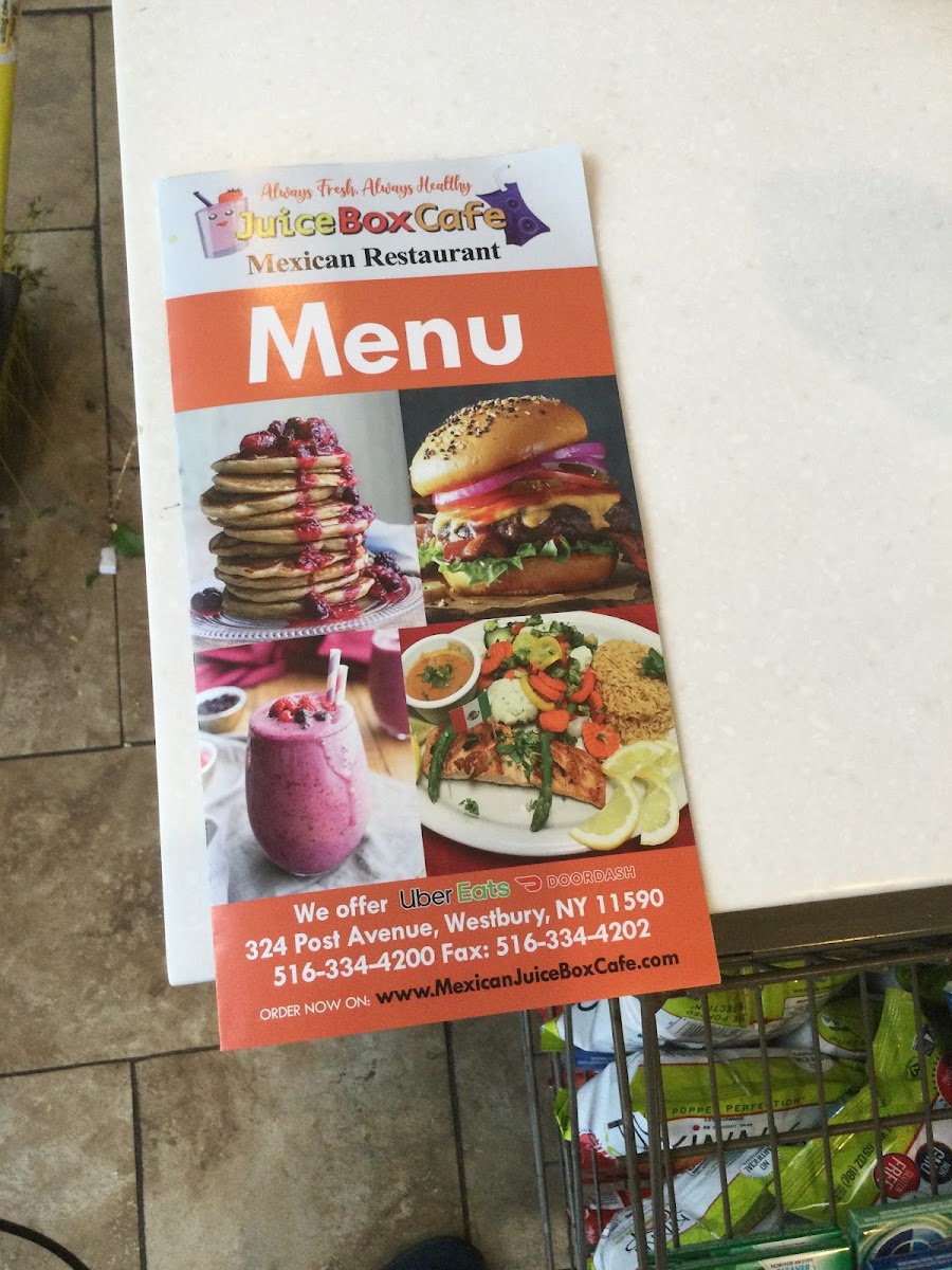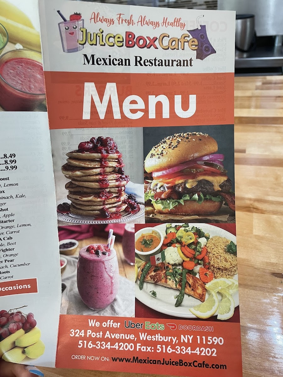 If you're looking for a vibrant place that celebrates Mexican flavors in a refreshing way, the Mexican Juice Box Cafe Menu is a must-try. Located at 324-1 Post Ave, Westbury, NY, this spot offers an exciting mix of beverages and light bites that will instantly transport you to the heart of Mexico. Whether you're in the mood for a tangy fresh juice, a smoothie packed with tropical fruits, or a bite of something savory, this menu has you covered. From zesty salsas to mouthwatering quesadillas, every item is crafted with care to deliver authentic and bold flavors. The menu offers something for everyone, making it the perfect place to grab a quick bite or enjoy a leisurely meal with friends.